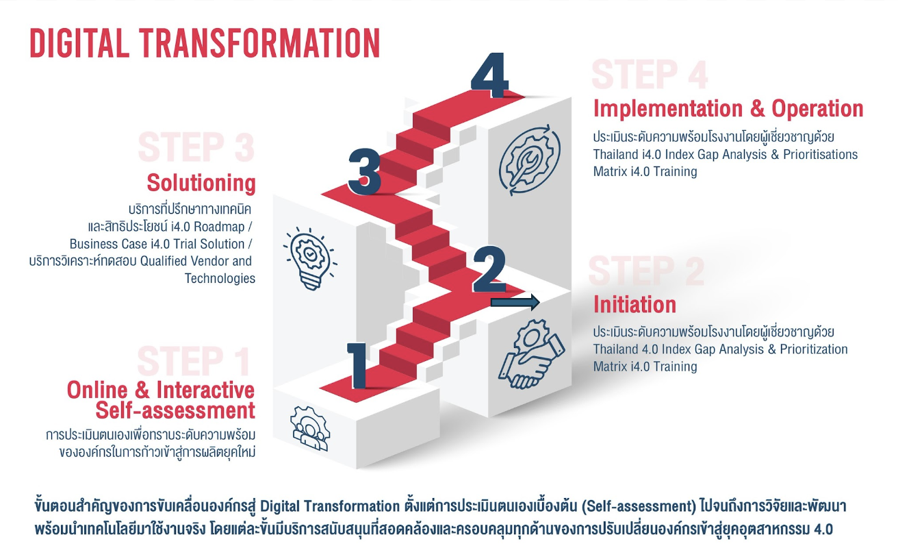 ขั้นตอนสำคัญของการขับเคลื่อนองค์กรสู่ Digital Transformation ตั้งแต่การประเมินตนเองเบื้องต้น (Self-assessment) ไปจนถึงการวิจัยและพัฒนา พร้อมนำเทคโนโลยีมาใช้งานจริง โดยแต่ละขั้นมีบริการสนับสนุนที่สอดคล้องและครอบคลุมทุกด้านของการปรับเปลี่ยนองค์กรเข้าสู่ยุคอุตสาหกรรม 4.0